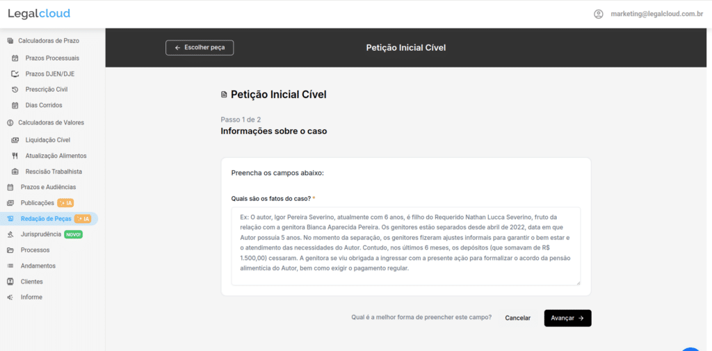 Por exemplo: ao optar pela redação de uma Petição Inicial, o fluxo da plataforma solicitará a descrição dos fatos, permitindo que você acrescente preliminares, teses jurídicas, fundamentos legais e jurisprudências relevantes para o caso.