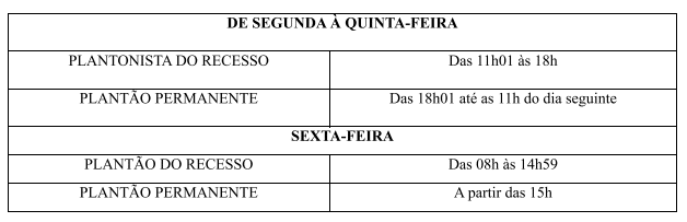 - Entre 11h01 às 18h de segunda a quinta, do juiz designado para o Plantão do Recesso na comarca da Capital